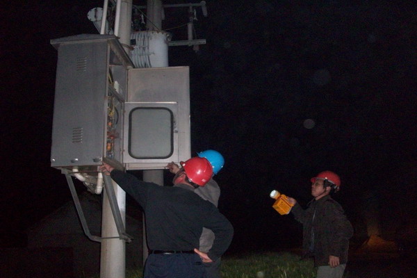 青口供電所為降低線損,采取多種措施消除線路和配變放電隱患。上圖為工人在夜間對設(shè)備進行檢查。(宋中文)