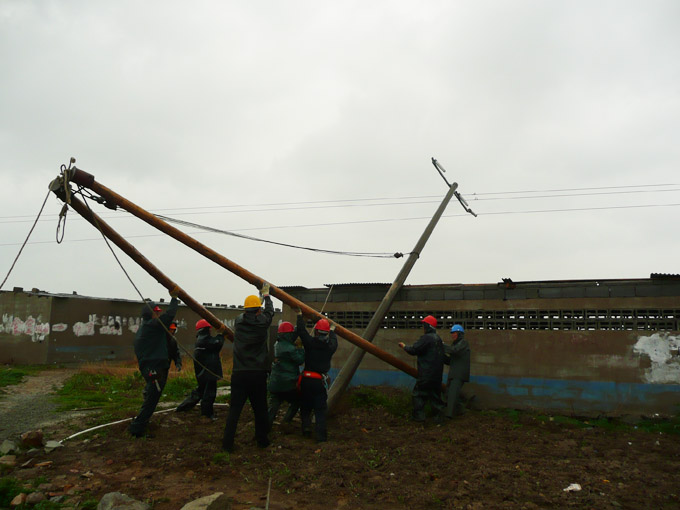 2月3日(正月初九)早上五點(diǎn)多,臺(tái)北供電所電力搶修值班室電話(huà)急促響起,變電所操作工反映10KV太和線(xiàn)跳閘失電。10KV太和線(xiàn)是臺(tái)北供電所非常重要的一條供電線(xiàn)路,是向順天木業(yè)、蘇交集團(tuán)、市政瀝青等大型企業(yè)供電的重要通道,失電意味著企業(yè)生產(chǎn)停工。接警后,供電所外線(xiàn)組組長(zhǎng)孫忠青立刻帶人沿線(xiàn)全面檢查。經(jīng)過(guò)兩個(gè)小時(shí)的排查,終于發(fā)現(xiàn)處于線(xiàn)路末端的高速公路低壓線(xiàn)路的五根電桿被施工的挖掘機(jī) 撞斷拉折。獲此情況,所領(lǐng)導(dǎo)立即組織人員,準(zhǔn)備材料,協(xié)調(diào)吊車(chē),安排運(yùn)送電桿。這時(shí)天空正下著小雨,更增加了施工的難度。為了盡快搶修,恢復(fù)供電,搶險(xiǎn)隊(duì)伍加速向事發(fā)地點(diǎn)開(kāi)進(jìn),寒風(fēng)中的雨滴,打在職工的頭上臉上,大家毫不在意,一心撲在搶修線(xiàn)路上。運(yùn)送電桿的道路泥軟地陷,機(jī)器吊裝遇到死角,他們就肩扛手拉。為了搶時(shí)間,爭(zhēng)速度,他們中午就在工地吃點(diǎn)快餐。在全體職工的共同努力下,到下午五點(diǎn)左右全面完成了搶險(xiǎn)工作。
