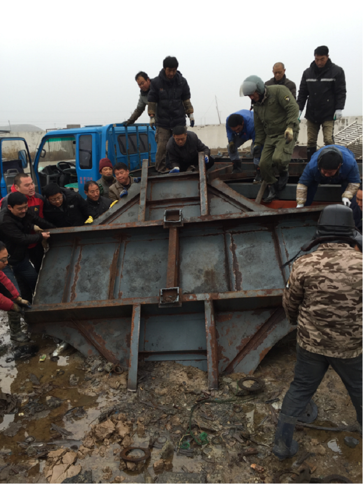 (上圖為標(biāo)準(zhǔn)化廠房的廢棄鋼材運送到日曬制鹽3場后家院,機械設(shè)備服務(wù)中心職工一起搬運鋼材。)