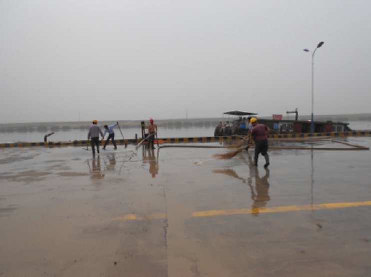 近期由于五灌河水位下降,給??看a頭的船只帶來(lái)了很大的安全隱患,于是公司決定對(duì)碼頭岸線(xiàn)的河道進(jìn)行一次清淤工作,在清淤的運(yùn)輸過(guò)程中使碼頭作業(yè)區(qū)一片狼跡,為了不影響宏港石化的PPA噸袋的吊裝業(yè)務(wù),6月11日上午公司班子成員主動(dòng)放棄休息日與上班工人一道對(duì)碼頭作業(yè)區(qū)進(jìn)行清理,他們有的用水槍沖,有的用掃帚掃,經(jīng)過(guò)二個(gè)多小時(shí)的奮戰(zhàn),作業(yè)區(qū)場(chǎng)地上渙然一新。(宵洋葛高平)