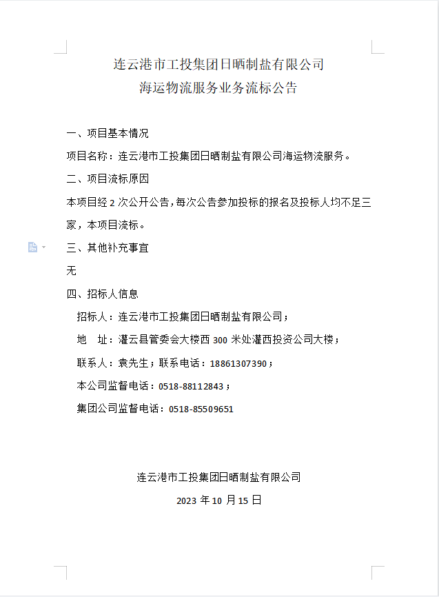 連云港市工投集團(tuán)日曬制鹽有限公司海運物流服務(wù)業(yè)務(wù)流標(biāo)公告