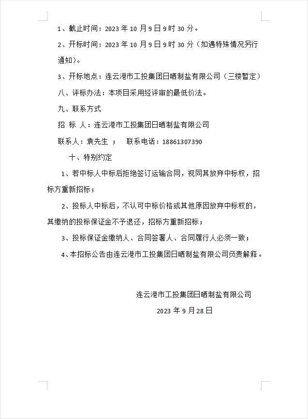 連云港市工投集團日曬制鹽有限公司海運物流服務(wù)業(yè)務(wù)招標公告
