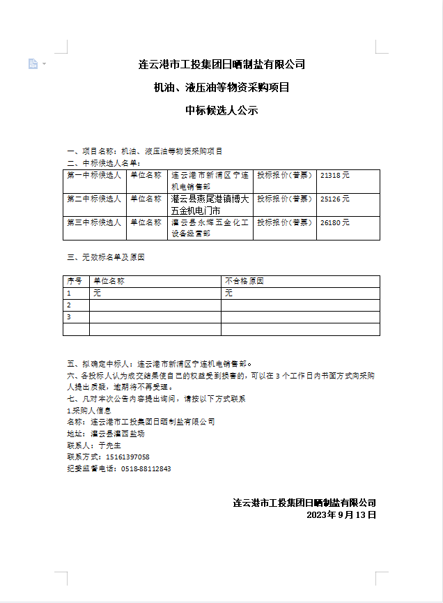 連云港市工投集團日曬制鹽有限公司 機油、液壓油等物資采購項目中標(biāo)候選人公示
