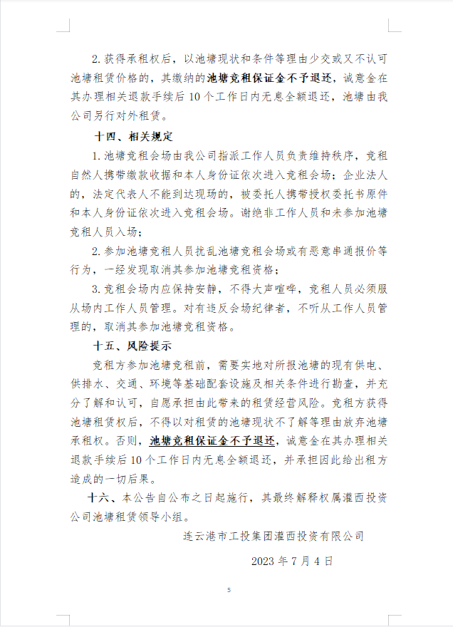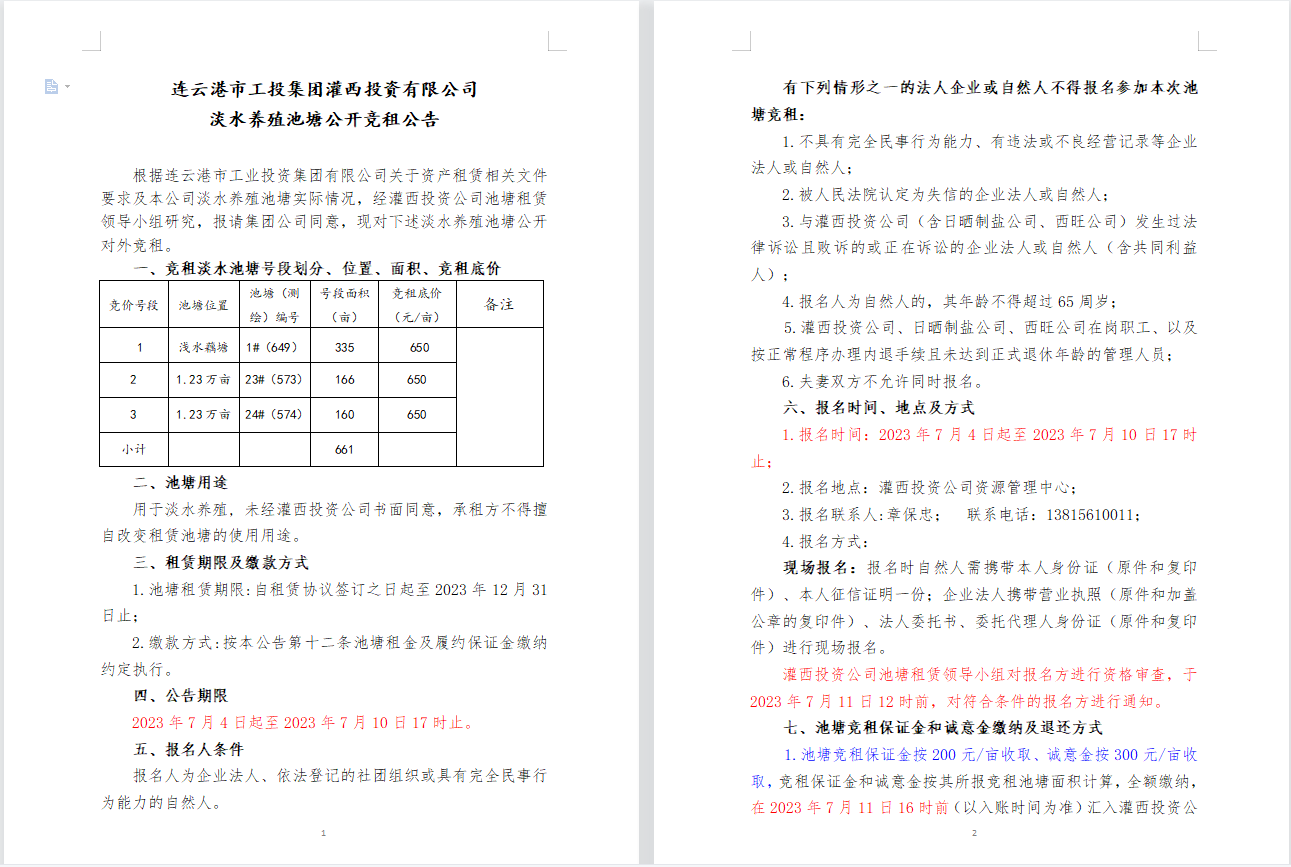 連云港市工投集團(tuán)灌西投資有限公司淡水養(yǎng)殖池塘公開競(jìng)租公告