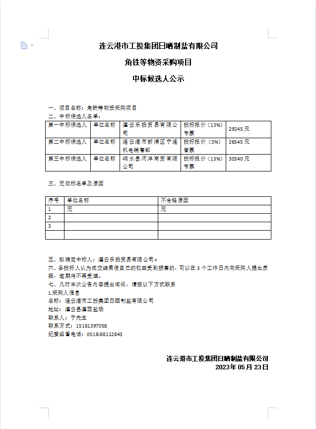 連云港市工投集團(tuán)日曬制鹽有限公司角鐵等物資采購(gòu)項(xiàng)目中標(biāo)候選人公示