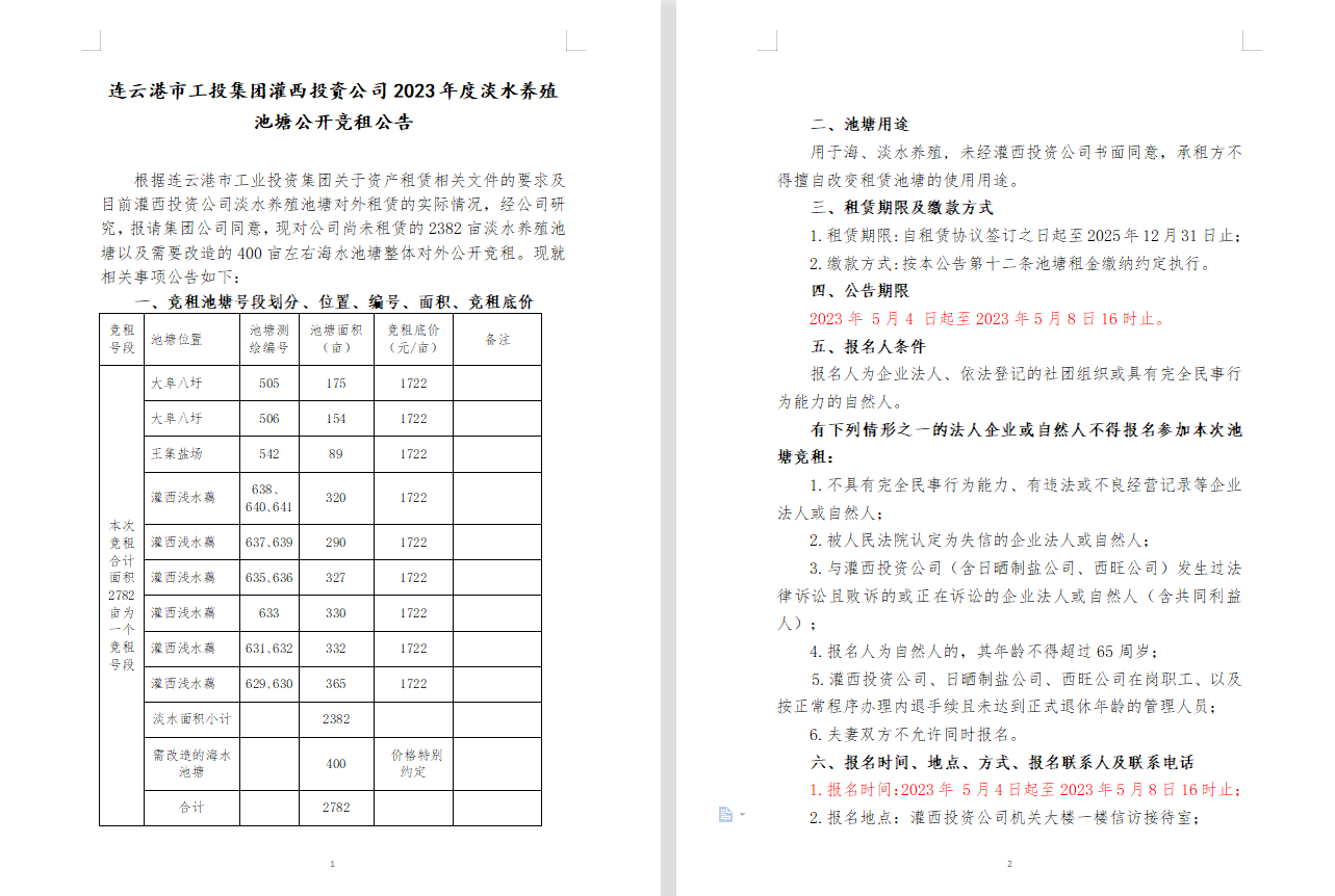 連云港市工投集團(tuán)灌西投資公司2023年度淡水養(yǎng)殖池塘公開(kāi)競(jìng)租公告