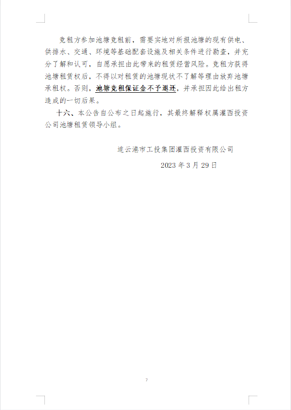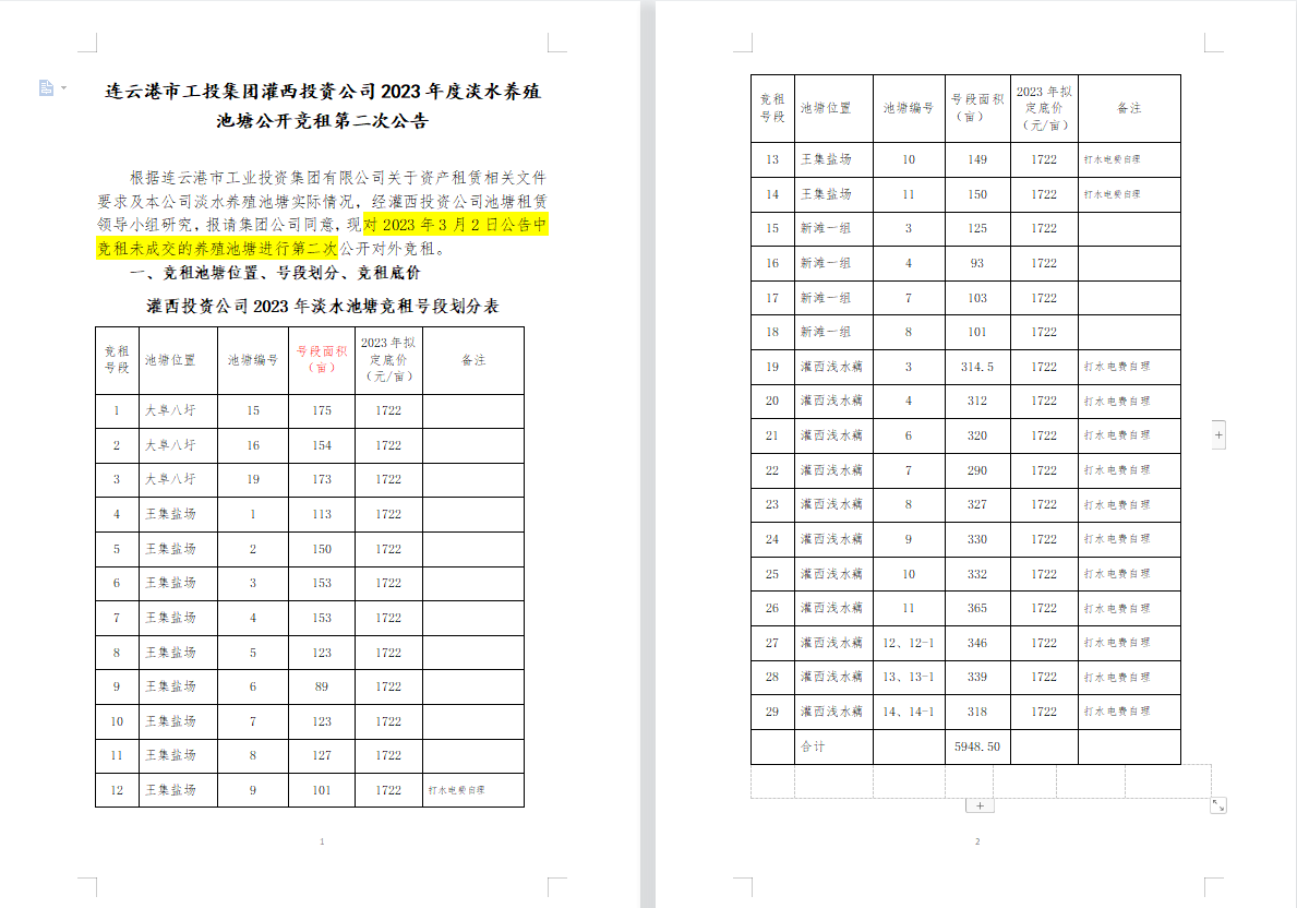 連云港市工投集團灌西投資公司2023年度淡水養(yǎng)殖池塘公開競租第二次公告