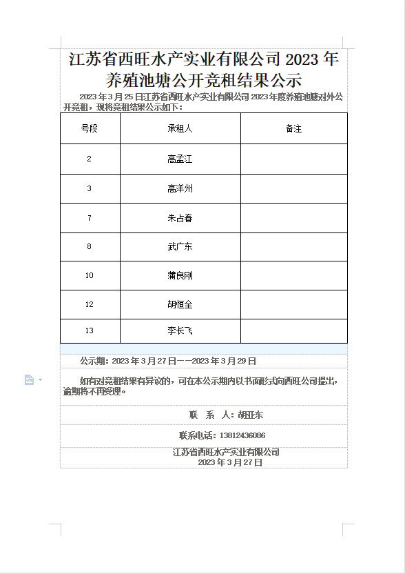 江蘇省西旺水產實業(yè)有限公司2023年養(yǎng)殖池塘公開競租結果公示