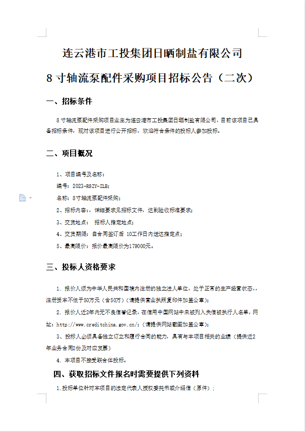 連云港市工投集團(tuán)日曬制鹽有限公司8寸軸流泵配件采購項(xiàng)目招標(biāo)公告(二次)