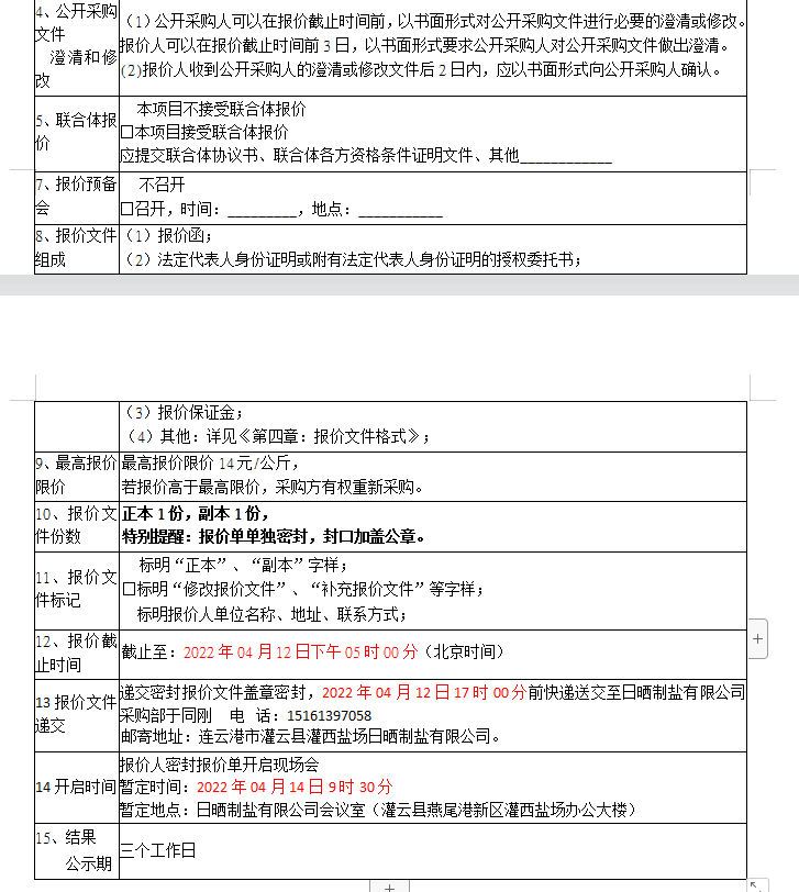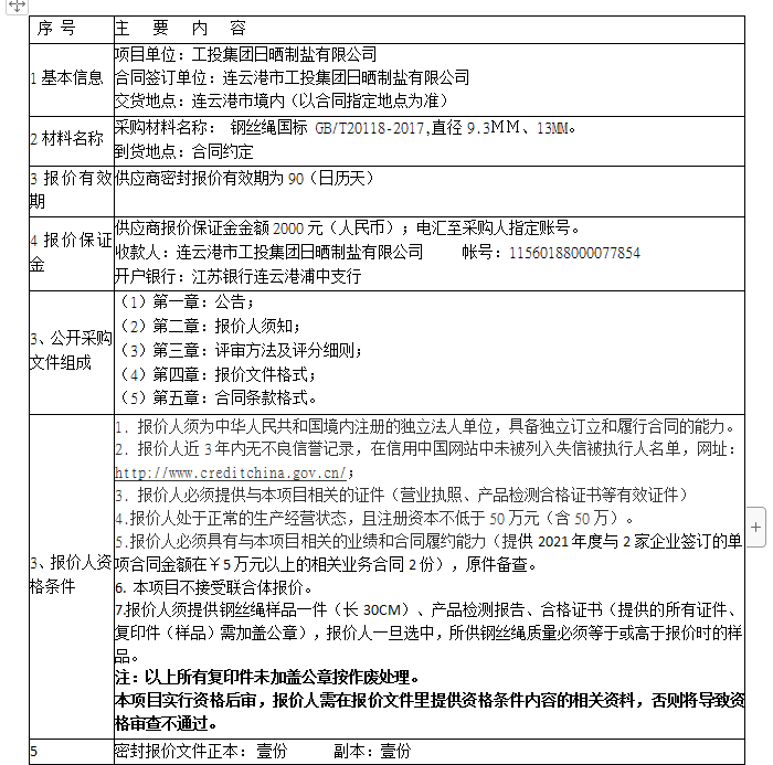報價保證金接收人:連云港市工投集團日曬制鹽有限公司。