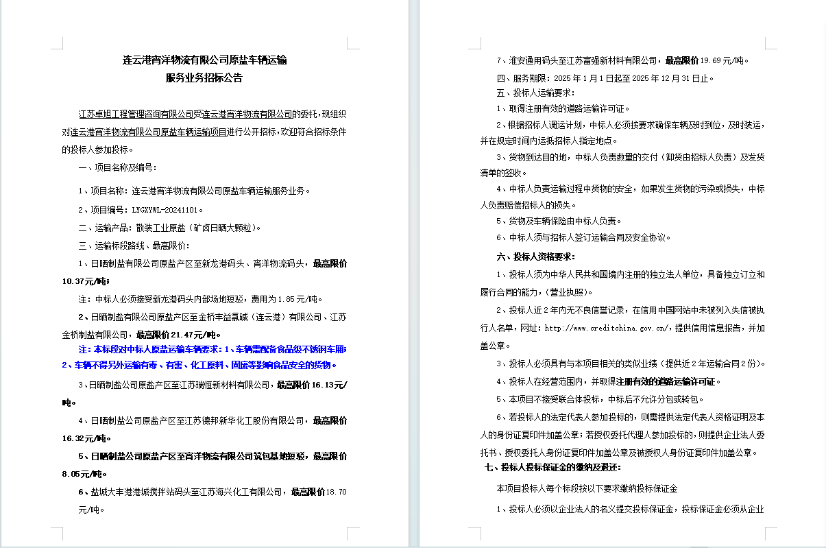 連云港宵洋物流有限公司原鹽車輛運輸服務(wù)業(yè)務(wù)招標(biāo)公告