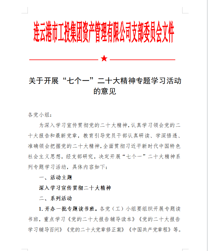 為在金融板塊快速掀起學習宣貫黨的二十大精神熱潮,支部精心組織、積極籌劃,完善學習方案,創(chuàng)新學習教育形式,豐富黨建活動載體,支部結(jié)合公司實際,專門制定《學習宣傳貫徹二十大精神學習方案》、《關(guān)于開展“七個一”二十大精神專題學習活動的意見》。