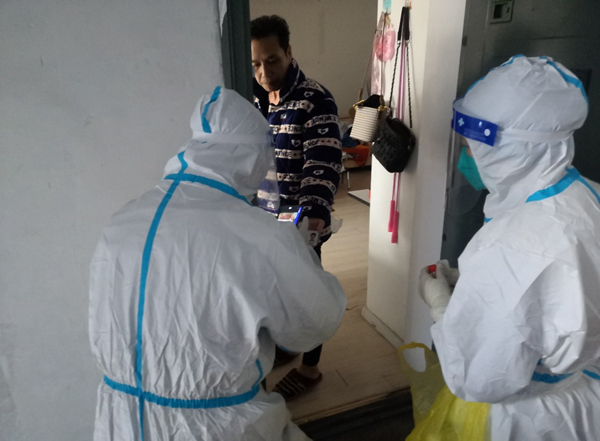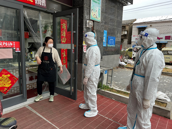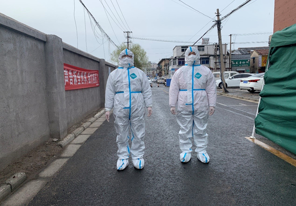 公司員工范益楊、李夢達(dá)是集團(tuán)抗疫志愿隊(duì)的隊(duì)員。在冷冽寒風(fēng)中,他倆身穿防護(hù)服挨家挨戶通知商戶暫停營業(yè),同樣的通知話語不厭其煩的重復(fù)著一遍又一遍,說得口干舌燥、疲憊不堪也未能阻攔他們繼續(xù)前進(jìn)的腳步。