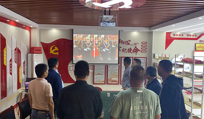 主題黨日活動(dòng)在國(guó)歌中拉開(kāi)了序幕。資產(chǎn)管理中心全體黨員列隊(duì)面向屏幕,觀看天安門(mén)廣場(chǎng)升國(guó)旗儀式視頻。